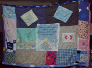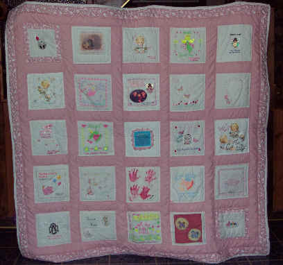 | <This is a beautiful handmade quilt made by the mommies of BabyCenter's June 2000 board. Each piece of fabric was chosen for a special reason, prepared and mailed to a location close to us where it was sewn by hand into this precious memories quilt. Click here to see close-ups of the squares. |