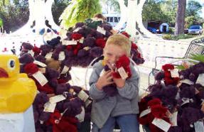 | This is big brother Rhett with some of the 250 plus bears that had been donated to Patrol Programs at the time in 2001. These include the 14 dozen donated by Mr. Russ Berrie of the Russ Corporation in Sailor's name. We have sent bears all over the country! Each bear is tagged with a special tag. |