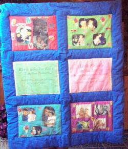| The August 99 mommies also sent a quilt to Rhett. His quilt features pictures of him and Sweetpea. Click here to see closer pics of this quilt. |