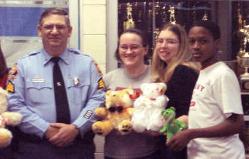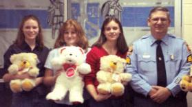 | Members of the Telfair County High School Y-Club with Officer Lacey of the Georgia State Patrol. The club members sponsored a highly successful "Teddy Bear Drive" collecting dozens of teddy bears to donate to the Georgia State Patrol in memory of Sailor Kate. Showing off some of the bears in the photo are Jo Ann Bartlett, Mindy Bowen, Elizabeth Graves, Officer David Lacey, Anna Carpenter, Jessica Dover, and Donnie Wooten. |