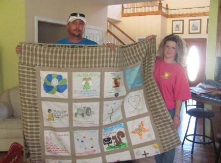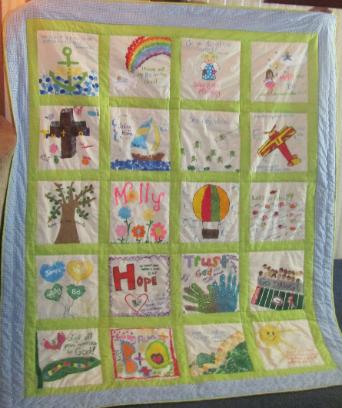 | Bo's Quilt This quilt was created in memory of Bo to offer his family warmth and comfort. The squares were painted by the children of Helena Baptist Church VBS 2012. This precious baby has cousins at HBC. Click here to see close-ups of Bo's quilt and here to see pics of HBC kids working on it. |
