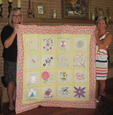 | Daisy's Quilt This quilt is in memory of sweet baby Daisy Arabella, daughter of hometown friends. Daisy's mom has been supportive of Sailor Kate Ministry and contributed to other memory quilts so it was an honor to present her with one for her precious angel. Daisy's mom Amber is shown here with Jill- click here to see close-up pics of Daisy's quilt. |