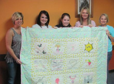| Emily's Quilt In 2010, Emily lost her parents and brother to a tragic accident. The children at Helena Baptist Church wanted to do something special for Emily in memory of her family to offer their heartfelt sympathy. The children at HBC Vacation Bible School of 2011 painted the squares to make this quilt. Emily's grandmother (Susan), great aunt (Carol), aunt (Anna Gail) and cousins (Amy and Kelly) are shown in this picture accepting it on her behalf. Click here to see close-up pics of Emily's quilt. |