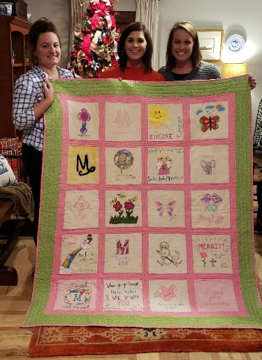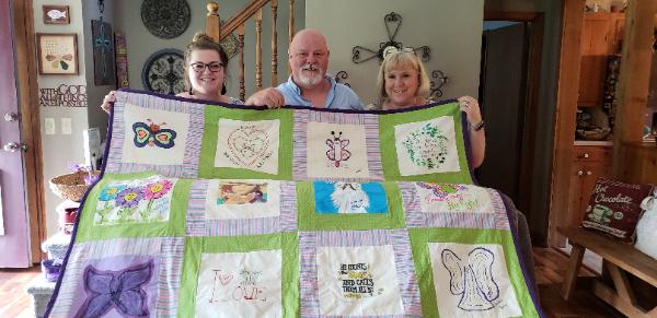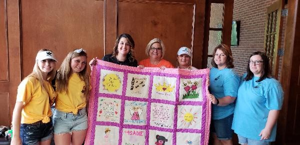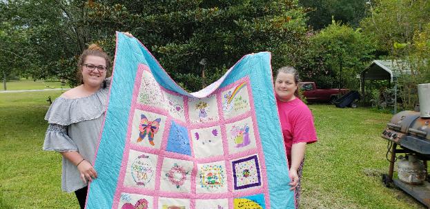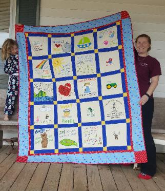 | This beautiful quilt was created with much love and prayer in memory of Sadie. It was stitched by Mrs. Reba Perkins. Click here to see more pictures of our visit with Sadie's family and here to see close-up pictures of the squares. |